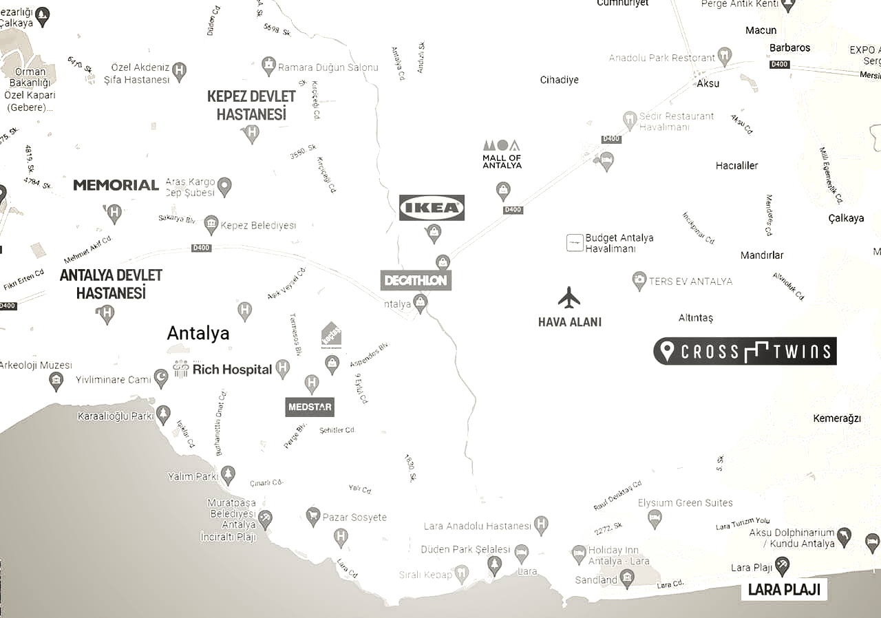 Проект Cross Twins расположен в районе Алтынташ, в 2.5 км от международного аэропорта Анталии, в 5 км от центра города и в 6 км от пляжа, с отличными социальными объектами для всех, предлагая легкий доступ ко всему.